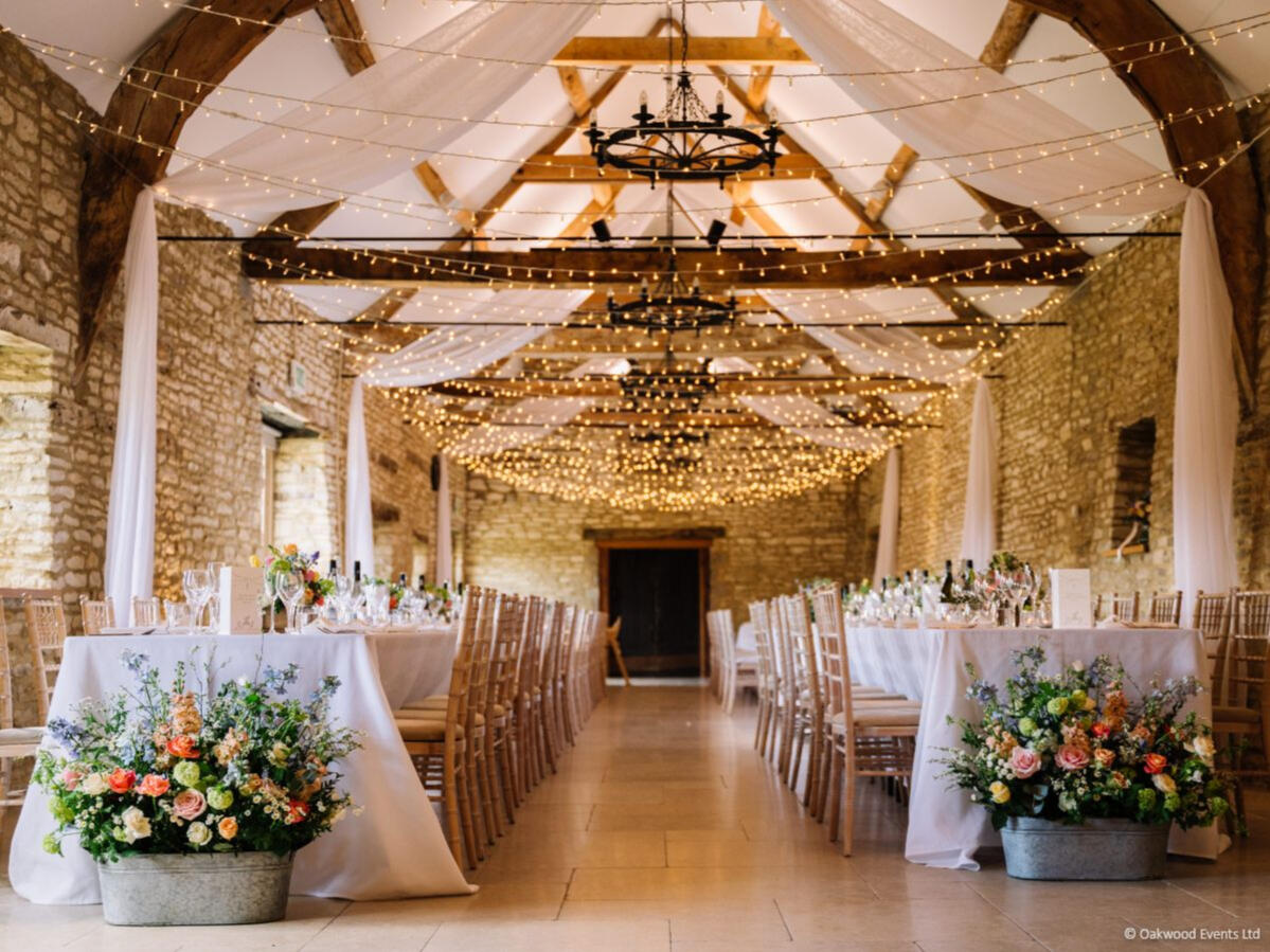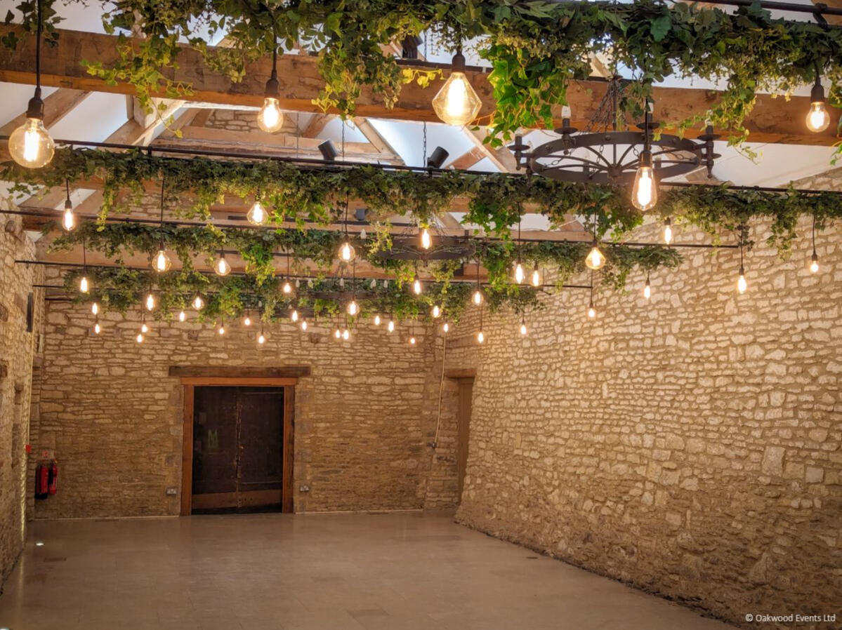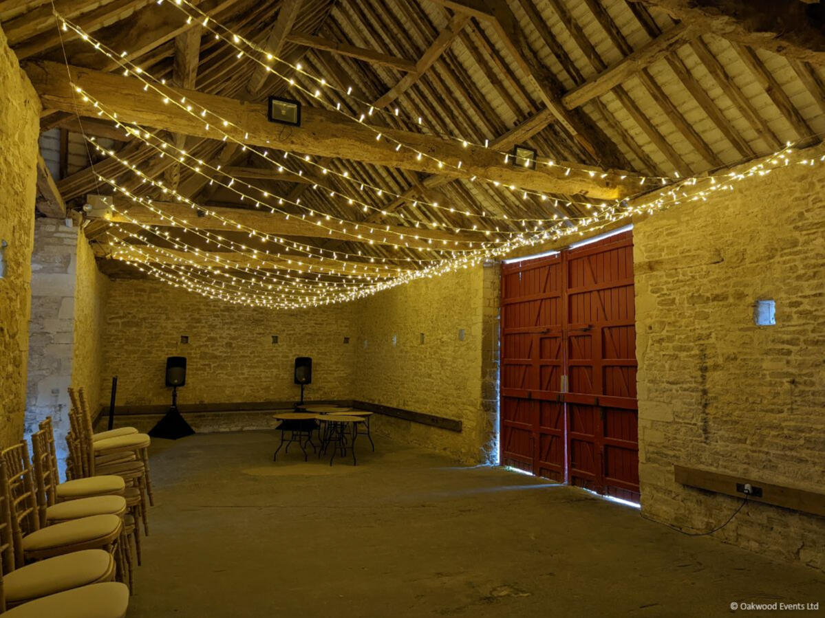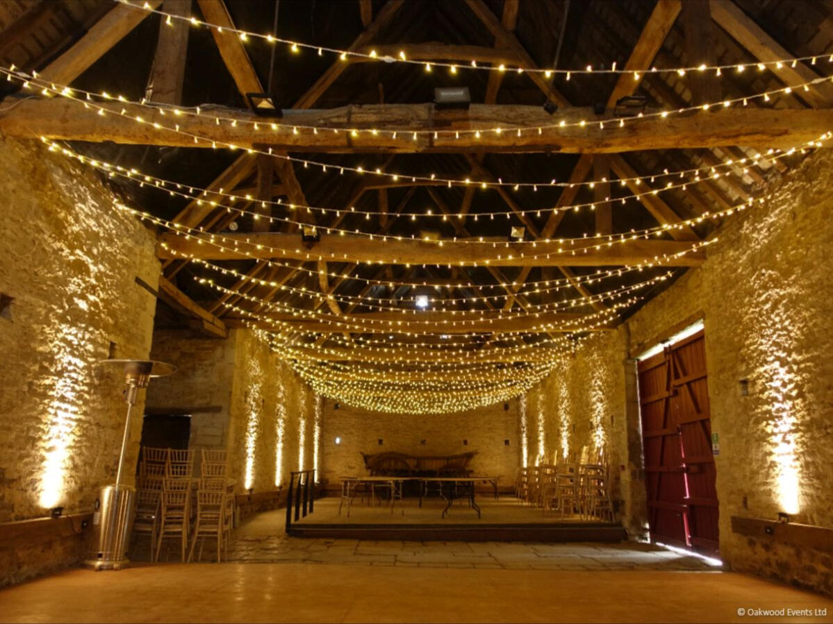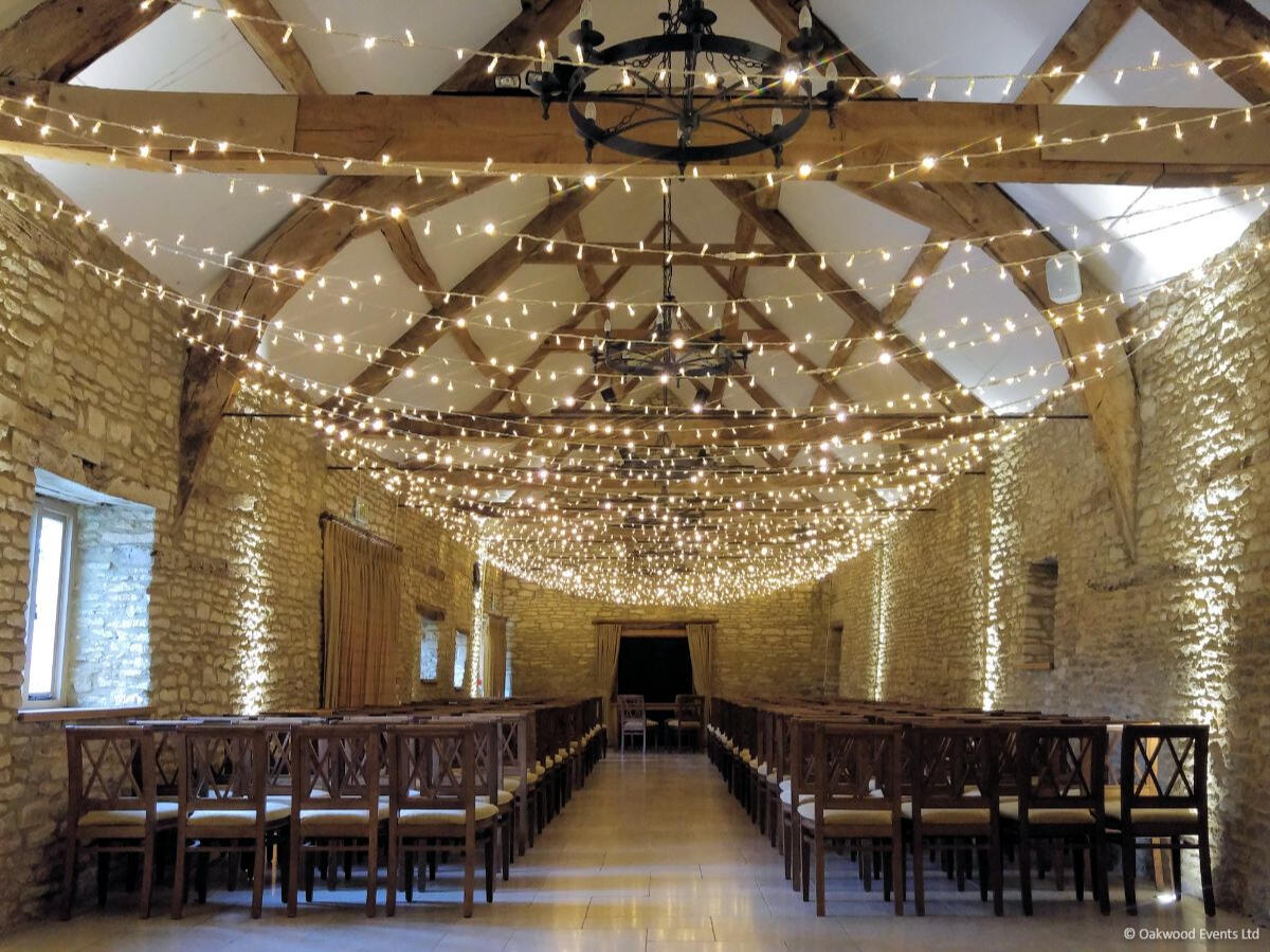 The two grand barns at Cogges offer a magnificent blank canvas for creative lighting. We specialize in installations that transform these historic agricultural spaces into elegant wedding venues, using delicate fairy light canopies and architectural uplighting to bring out the natural character of the stone and wood.Below is a small selection of the designs we offer for this stunning venue. For our full offering, please request a brochure.