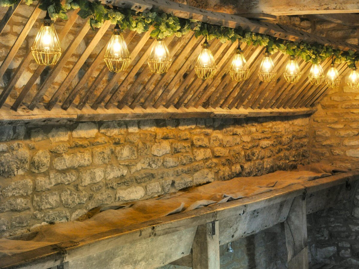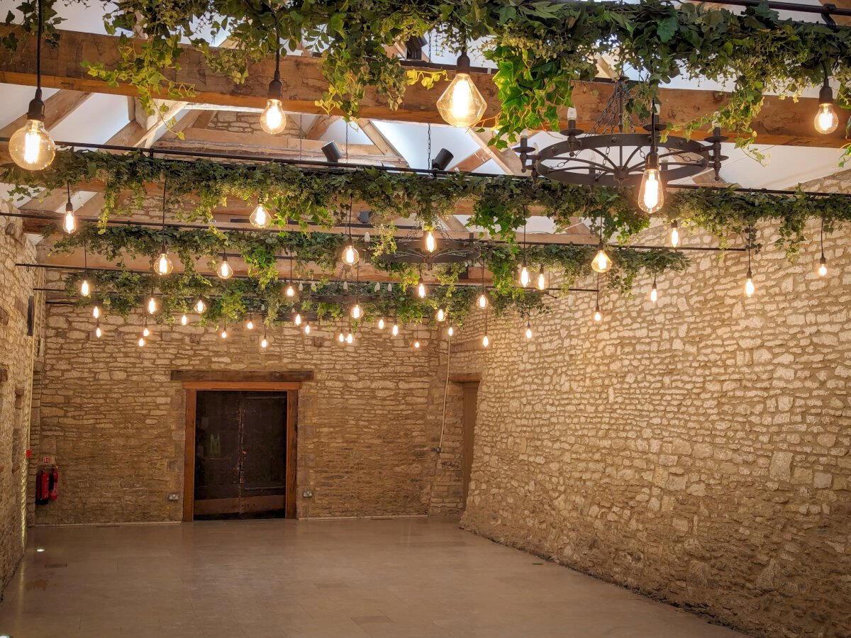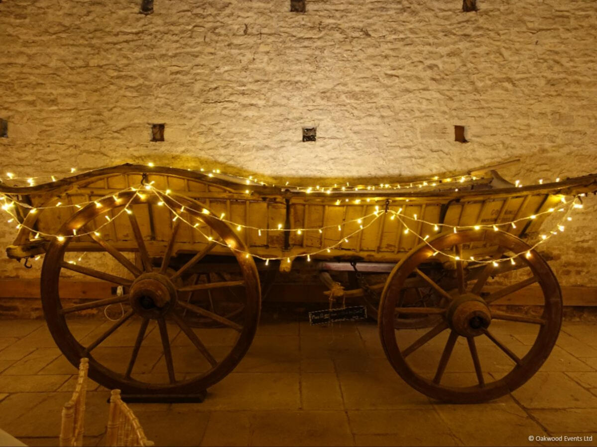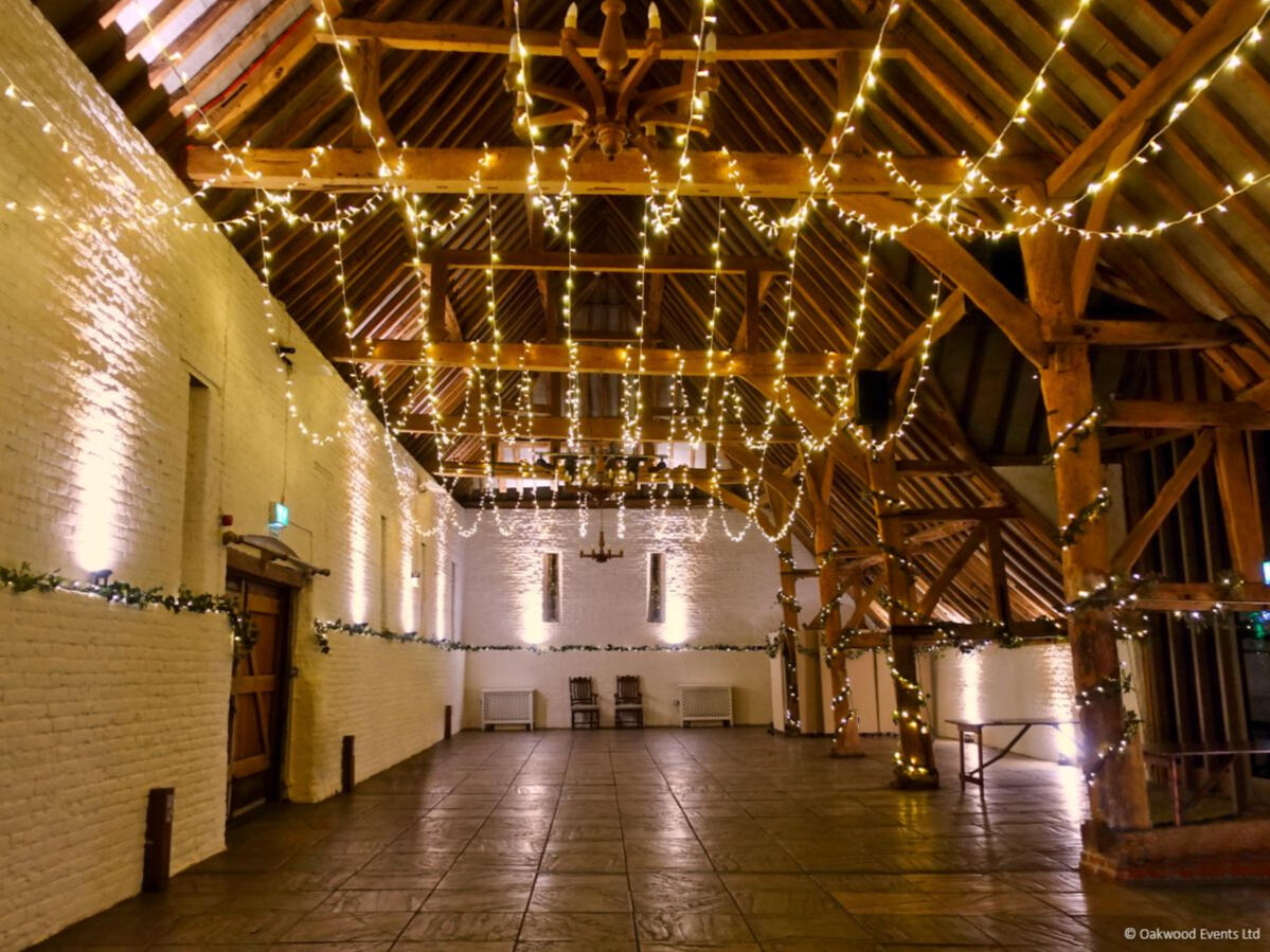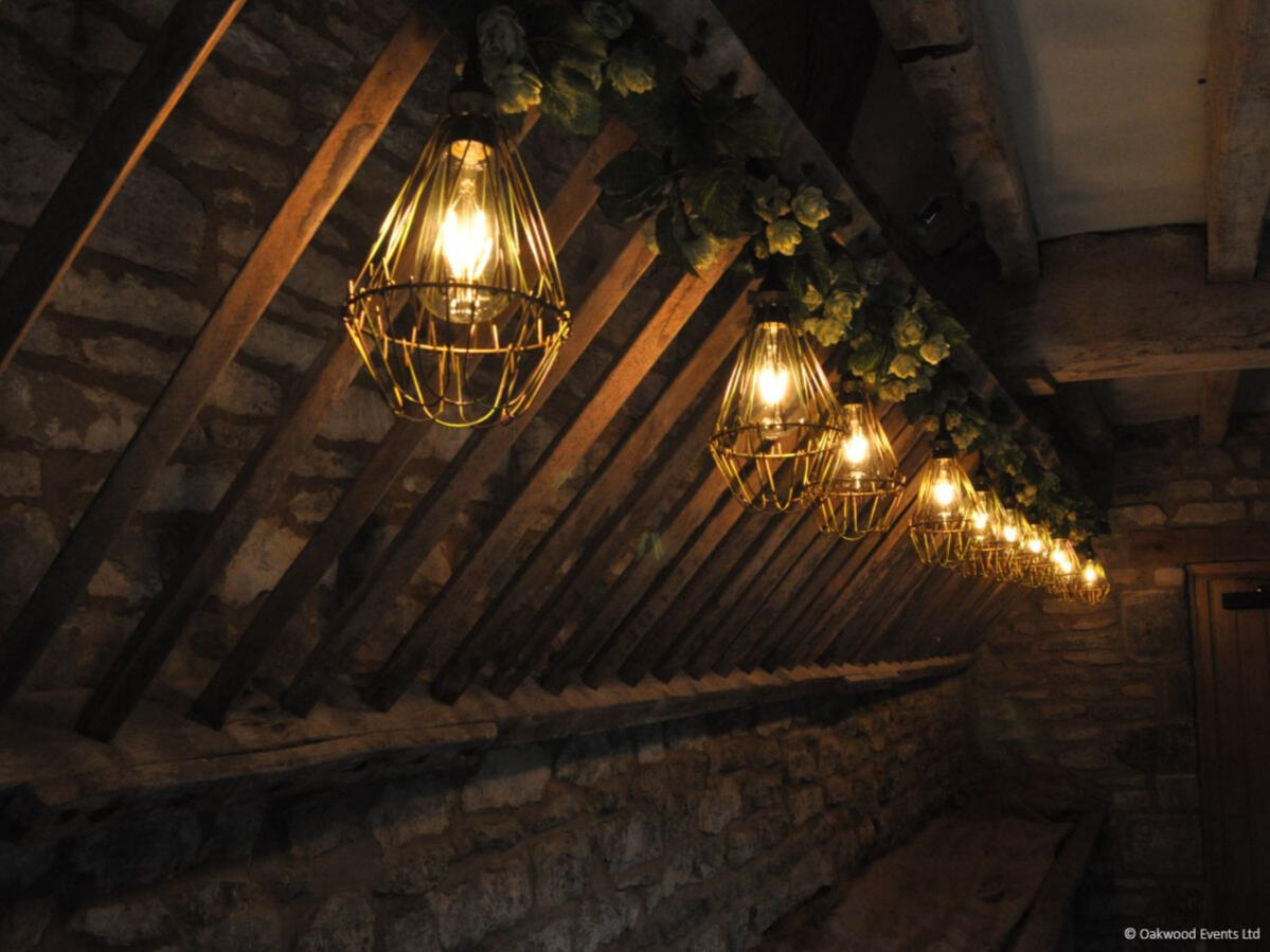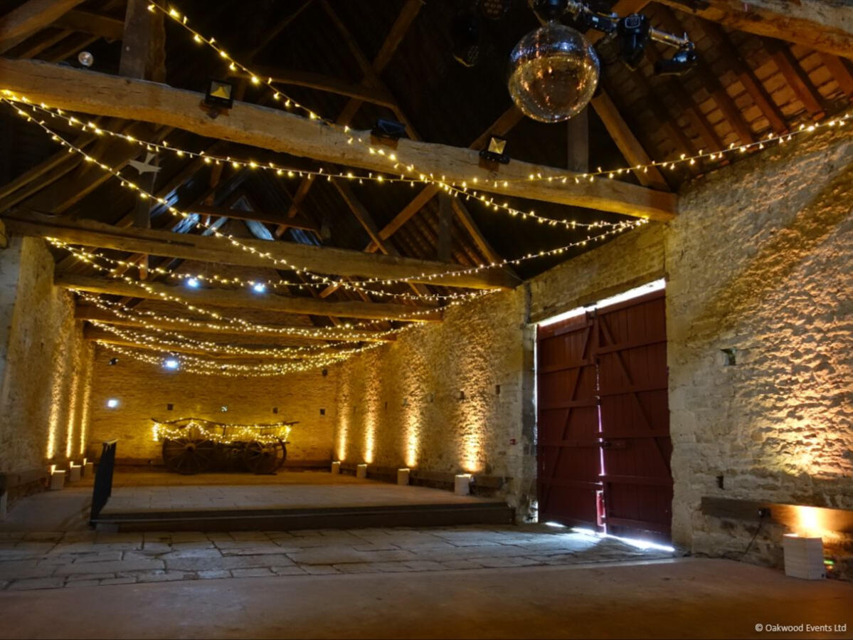 The two grand barns at Cogges offer a magnificent blank canvas for creative lighting. We specialize in installations that transform these historic agricultural spaces into elegant wedding venues, using delicate fairy light canopies and architectural uplighting to bring out the natural character of the stone and wood.Below is a small selection of the designs we offer for this stunning venue. For our full offering, please request a brochure.