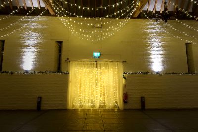 Oakwood Events Blog PostWe added this shimmering backdrop of fairy lights to the rear doors behind the top table for a wintery wedding at Ufton Court, alongside a multi-swag fairy light canopy and LED uplighters.